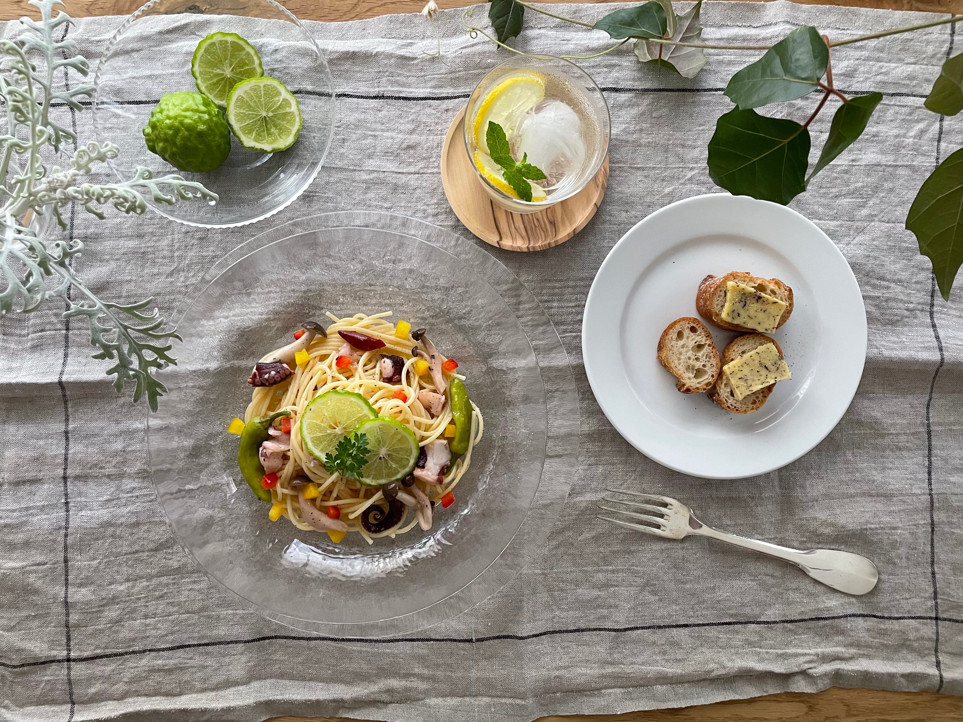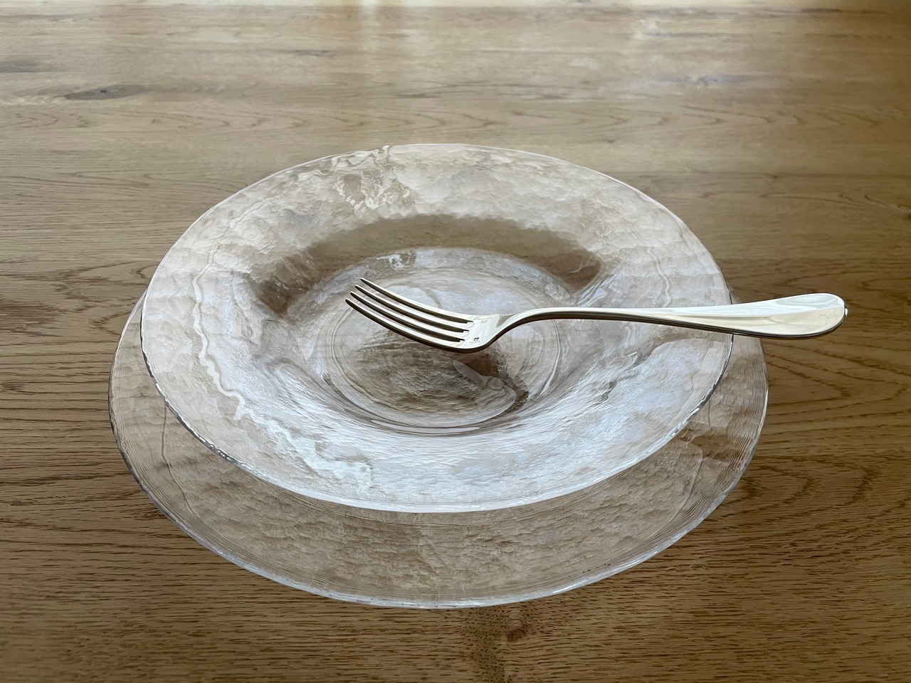 ドイツでデザインされたガラスプレートです。ディナーサイズで広めのリムが品良く、パスタや前菜、サラダはもちろん、ワンプレートにも。3,4枚目の画像のように同シリーズの24cm深皿と重ねて、ちょっとフォーマルなテーブルコーディネートも愉しめます。