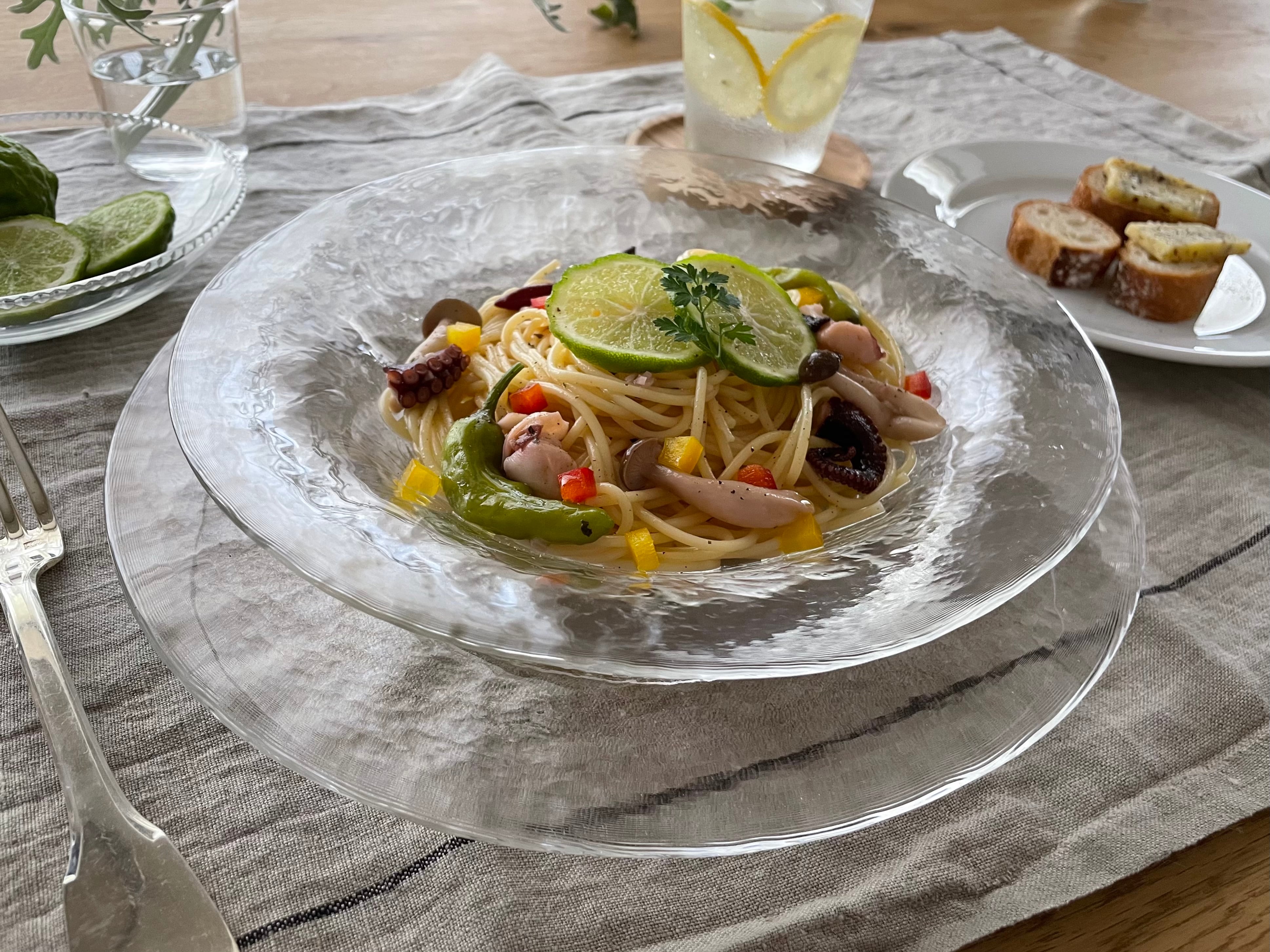 表面は滑らかで、裏側には氷を思わせる凹凸が施されています。深さを生かして、ソースたっぷりのパスタやスープ、冷やし中華などに、またたっぷり目のサラダにと活躍の機会の多い深皿タイプ。画像のように同シリーズの28cm平皿と重ねると、ちょっとフォーマルなテーブルコーディネートにも。