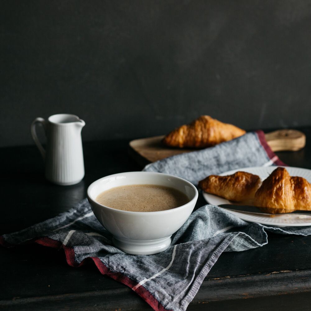 少し青みをたたえた白磁のカフェオレボウル。容量は500ccとたっぷりサイズです。