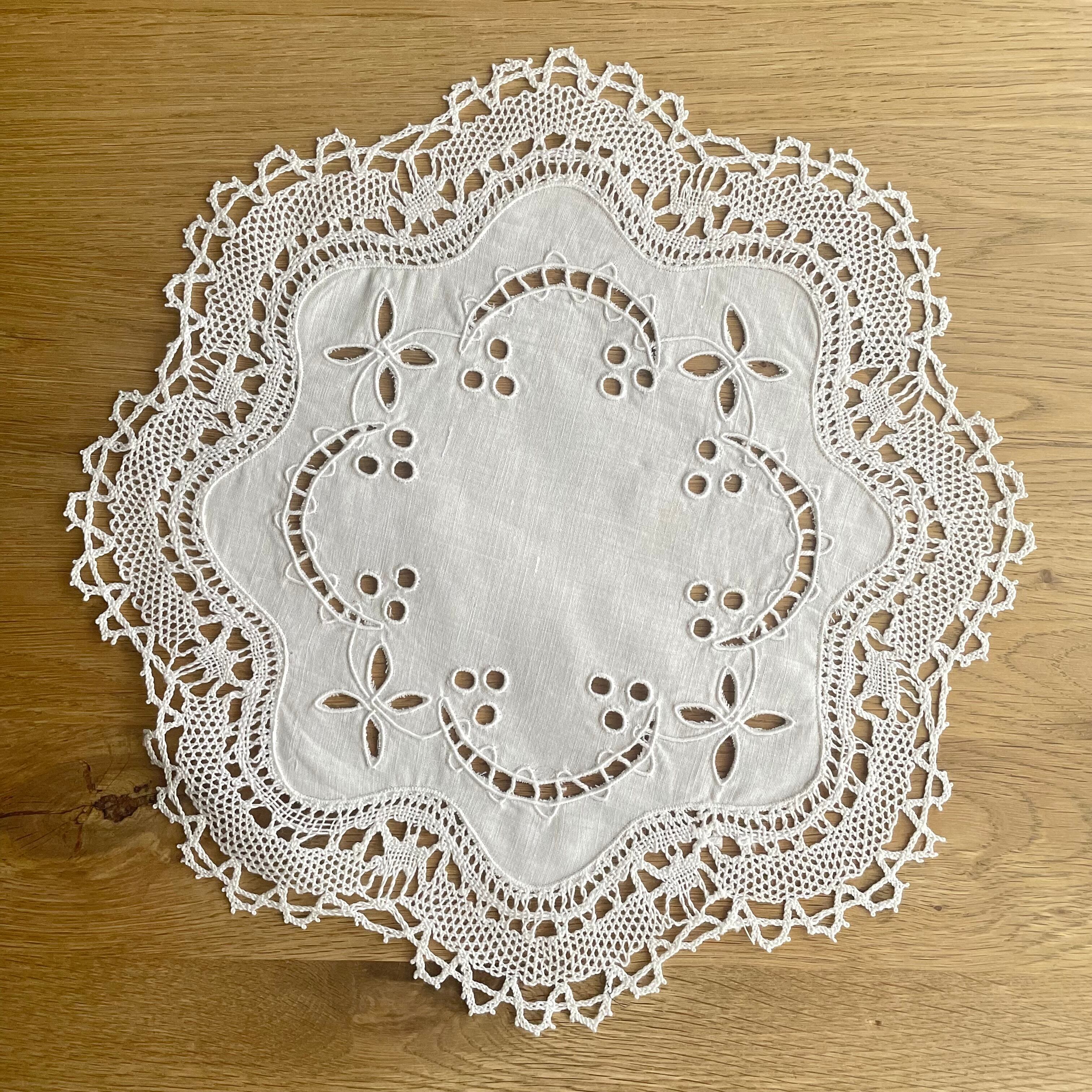 ハンドメイドの美しいカットワークが施されたレースのテーブルマットです。