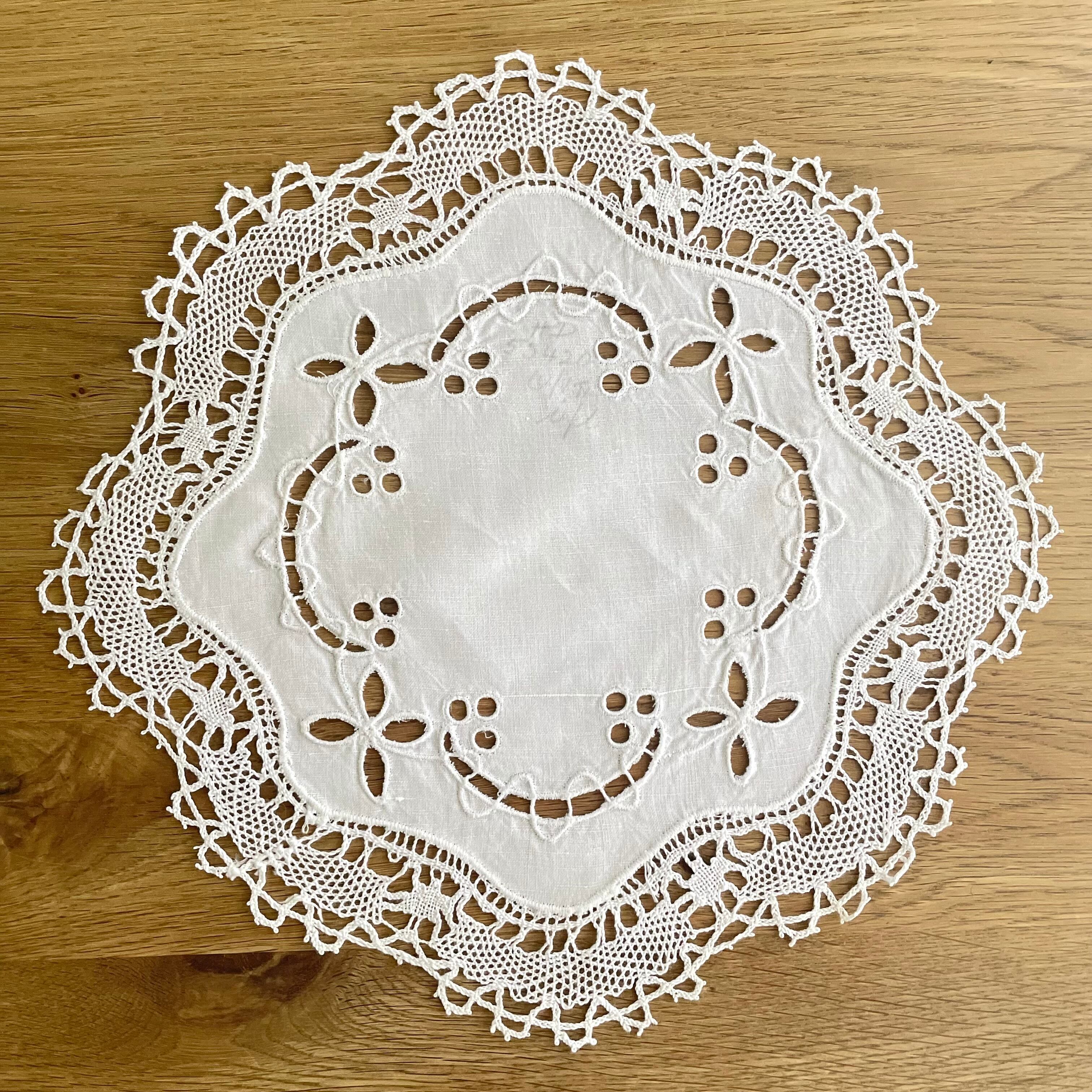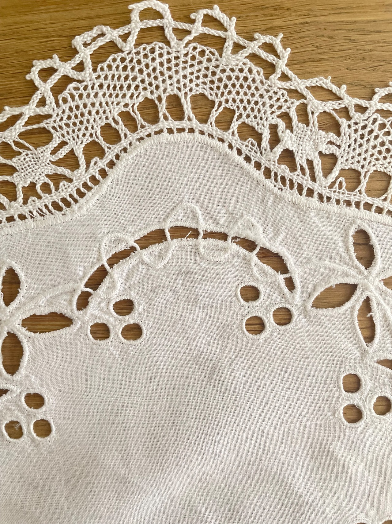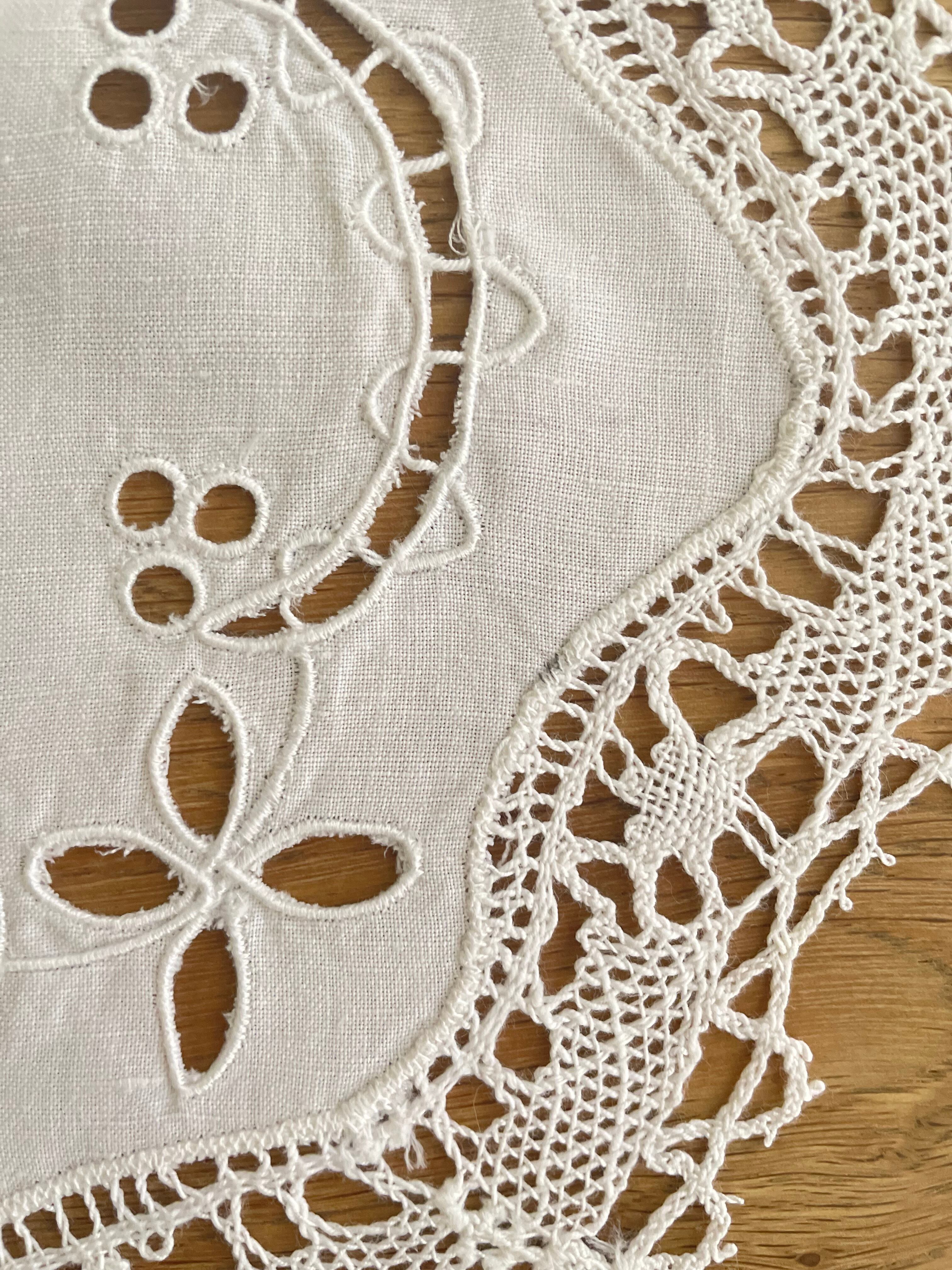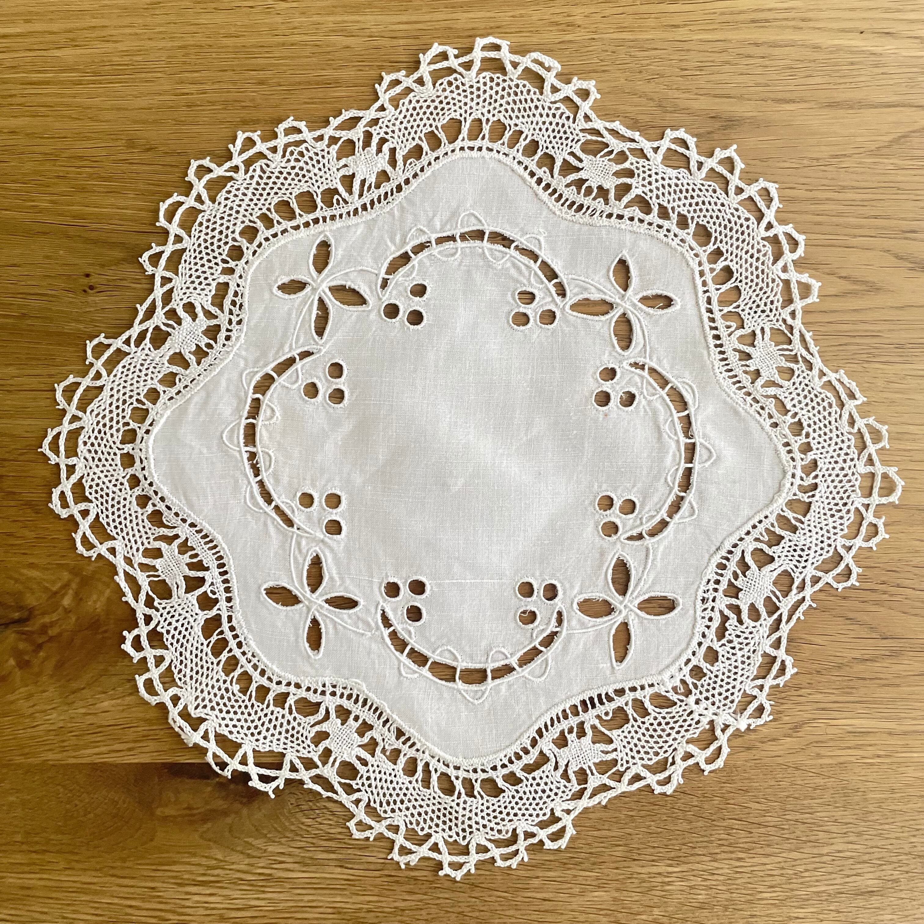 ハンドメイドの美しいカットワークが施されたレースのテーブルマットです。