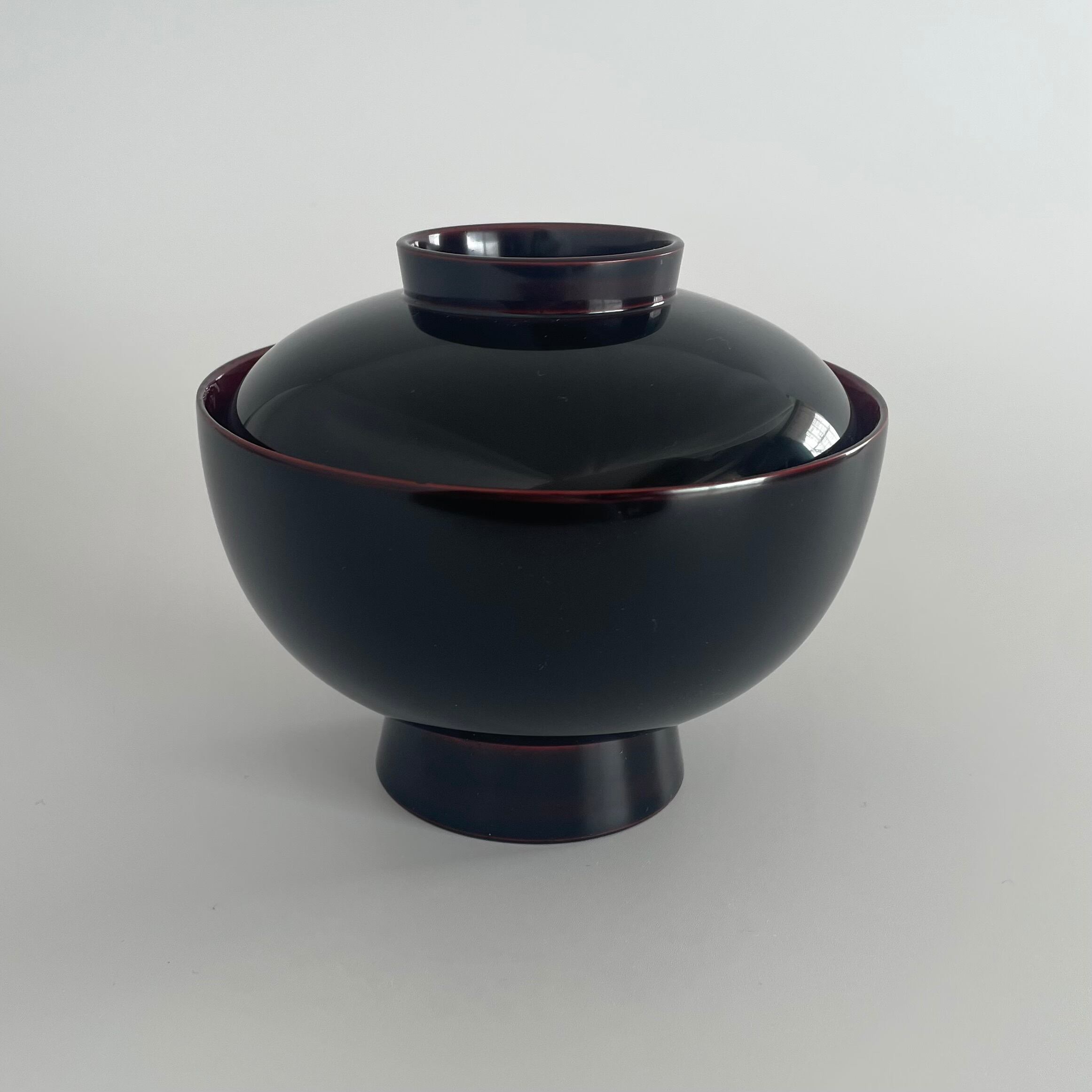越前塗の蓋つき雑煮椀です。溜塗に内側を朱で仕上げてあります。